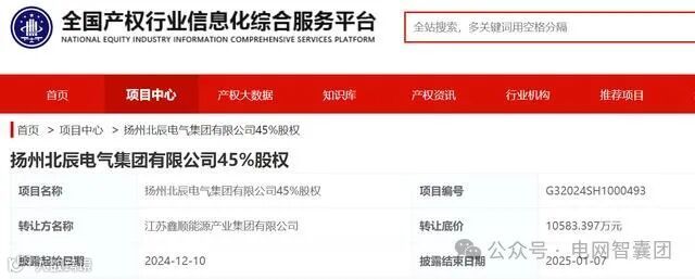 12月10日,全国产权交易中心显示,扬州北辰电气集团有限公司45%股权挂牌转让,转让底价约1.06亿元,转让方为江苏鑫顺能源产业集团有限公司,披露结束日期为2025年1月7日。