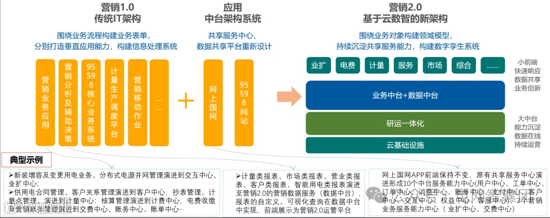 营销2.0系统建设是加快公司数字化转型、提升客户体验、快速响应业务需求的重要举措,按照“数据不搬家,业务上中台”的原则,融合原营销1.0各单体应用到营销2.0中台微服务架构,推进营销1.0全面重构升级,实现一前台,一中台(客户服务业务中台),两服务(营销业务服务和营销数据服务),一中心(客户物联应用中心),五平台,建成对外具有“客户聚合、互动智能、业务融通、数据共享、架构柔性、迭代敏捷”特征的营销数字化服务系统。