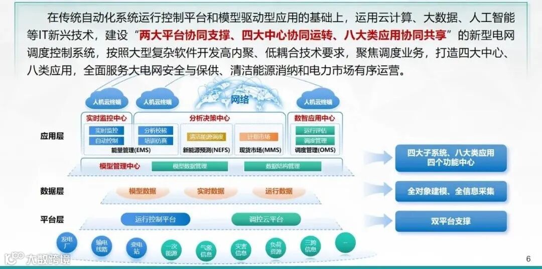 新一代省级以上电网调度技术支持系统构建了系统体系架构及总体要求,包括:模型管理中心、实时监控中心、分析决策中心、数智应用中心等四大功能中心和实时监控、自动控制、分析校核、清洁能源预测、计划市场、培训仿真、运行评估、调度管理等八大类应用功能与场景的技术要求。这些应用功能是在智能电网调度控制系统(D5000)已有功能基础上,根据新业务需求和系统总体架构特点,进行了完善提升和创新,有力地推进新一代省级以上电网调度技术支持系统标准化建设,为构建新型电力系统,服务电力市场化改革,保障“绿色低碳、安全高效”能源体系运转提供坚强支撑。