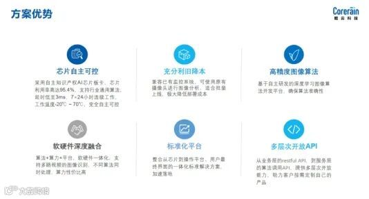 该方案中底层算力采用的定制数据流架构是与英伟达GPU等基于指令集架构产品完全不同的方式,属于国际首创的芯片架构技术,并自主研发基于定制数据流架构的AI推断芯片CAISA,利用率可高达95.4%,相比市面常用深度学习加速硬件提供最高10倍以上资源利用率,可基于国产制造工艺领先巨头产品高达4.12倍实测性能;最低3ms延时,深度学习算法的计算延时及能效比得到成倍提升,更适合实时应用;提供不同边缘计算平台,支持横向扩缩容的多类型计算节点,实现多路视频结构化分析,为智能化升级项目提供高性能高算力性价比、国产化的计算加速方案。