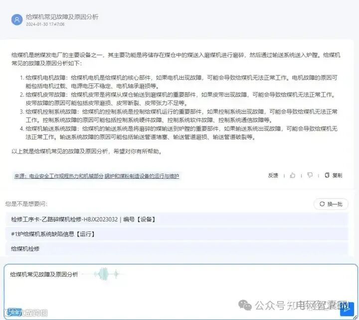 2024年1月29日,国家能源集团国电电力应用国产开源大模型技术进行电厂智能化系统升级,依托上海庙公司构建了火电领域首个燃煤电厂专属的“智能大脑”——AI助手,为电厂智能化发展提供了全新的解决方案。