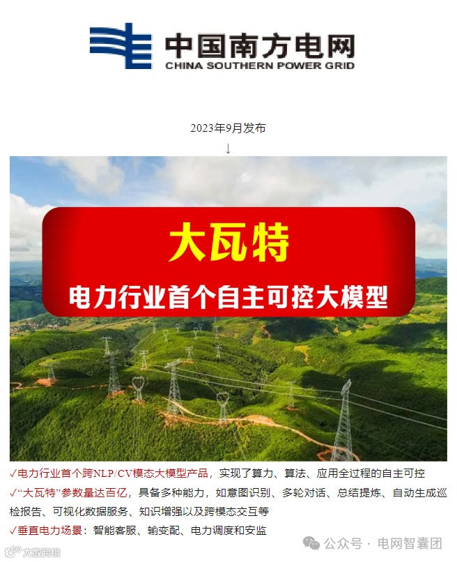 2023年9月26日,南方电网人工智能公司正式发布了电力行业人工智能创新平台及自主可控电力大模型,并命名为“大瓦特”。