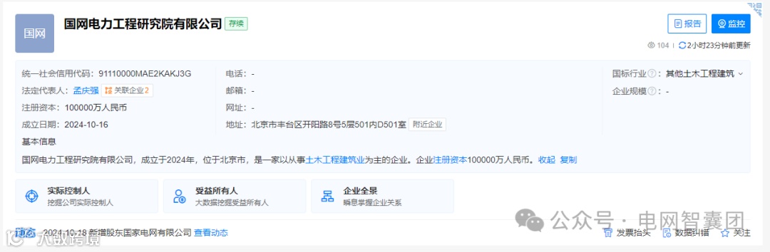 【国网电力工程研究院有限公司】于2024年10月16日成立,法定代表人为孟庆强,注册资本10亿人民币,经营范围检验检测服务,建设工程质量检测,建设工程设计,人工智能应用软件开发等。股权穿透显示,该公司由国家电网有限公司全资100%控股。