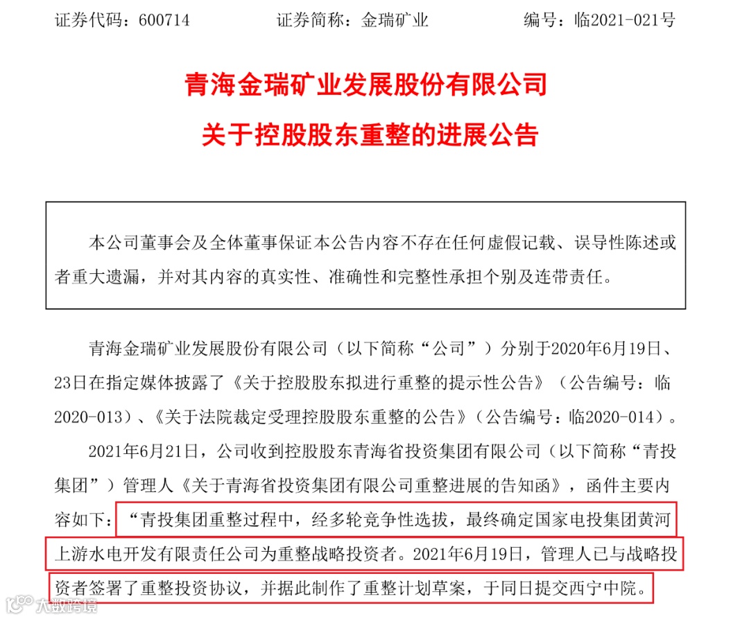2021年6月22日,金瑞矿业(600714.SH)公告称,控股股东青海省投资集团有限公司管理人发送的《关于青投集团重整进展的告知函》称,“青投集团重整过程中,经多轮竞争性选拔,终确定黄河公司为重整战略投资者”。