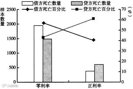 图1 借贷双方的死亡情况:零利率和正利率的比较