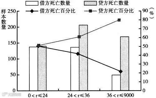 我们首先分析贷方死亡数量及死亡比例与利率高低的相关性。如果贷方在借贷交易中具有强势地位,且其收取的利率越高,说明其强势地位越高,那么,利率越高,发生纠纷冲突时贷方死亡的可能性应该越低,至少不应该越高。图1显示,在零利率借贷命案中借方被打死的比例高于贷方,但在正利率借贷命案中60%的时候是贷方被打死。在图2中,我们把借贷利率大于零的命案细分成三段。这里,在借贷利率为0%到24%区间时,贷方与借方被打死的概率基本一样;在24%至36%利率区间,贷方死亡率约62%;而如果借贷利率超过36%,亦即人们通常定义的高利贷,那么,约80%的时候是贷方被打死。贷方死亡的概率明显随着利率的上升而上升。⑬