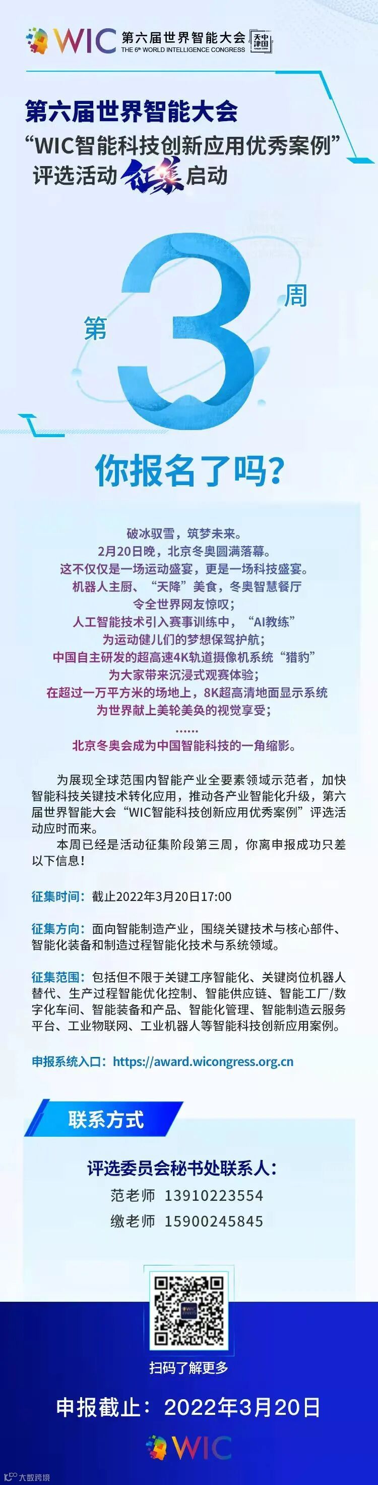 第六届世界智能大会“WIC智能科技创新应用优秀案例”评选活动征集启动第三周,你报名了吗?