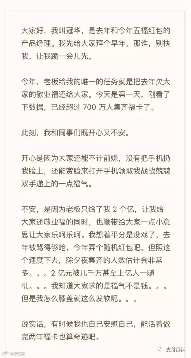 所以,支付宝官方微博发了一个消息,支付宝有一个叫“冠华”的支付宝五福红包产品经理,跳出来承认所有错误了,发表了一篇“声情并茂”的自白