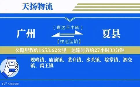 13826279566点击拨打电话 天扬物流广州至夏县专线1653.62公里27小时33分钟极速直达,全程高速覆盖夏县全域及瑶峰镇、庙前镇、裴介镇、水头镇、埝掌镇、泗交镇、禹王镇,主城区免费上门提货。提供整车/零担/冷链/大件运输,配备AI监控+三维固定+温控技术,支持运输险及智能动态计费,企业可定制月结方案。