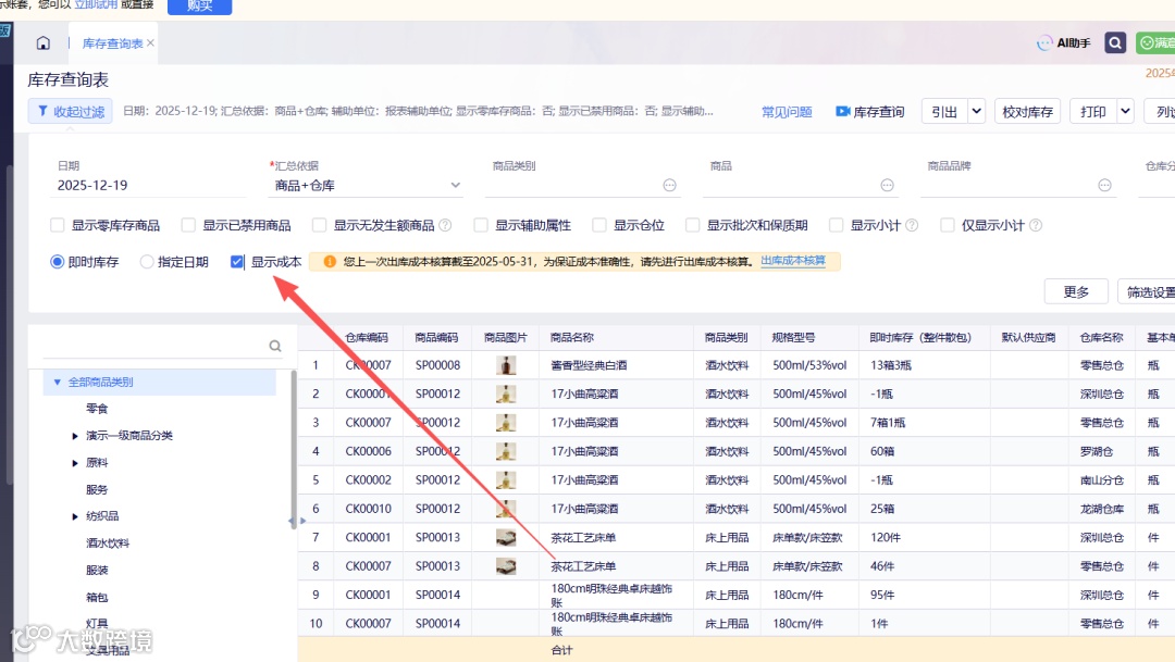 首先,点击打开【库存管理】-【库存查询表】界面,勾选计算成本(确定查询时已做过出库核算),并在列设置开启显示成本列。