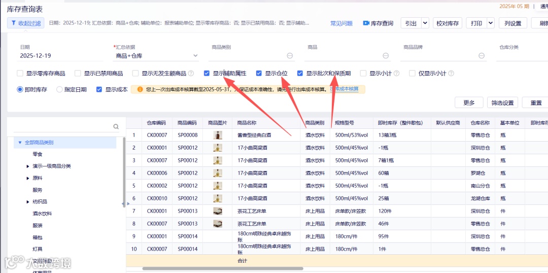 首先,点击打开【库存管理】-【库存查询表】,勾选显示仓位、辅助属性、批次和保质期再查询即可,如图: