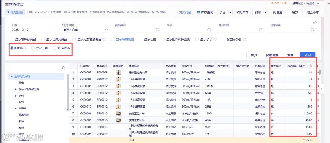 (1)即时库存:按系统查询的时间点统计库存数据,将展示即时库存和可用库存