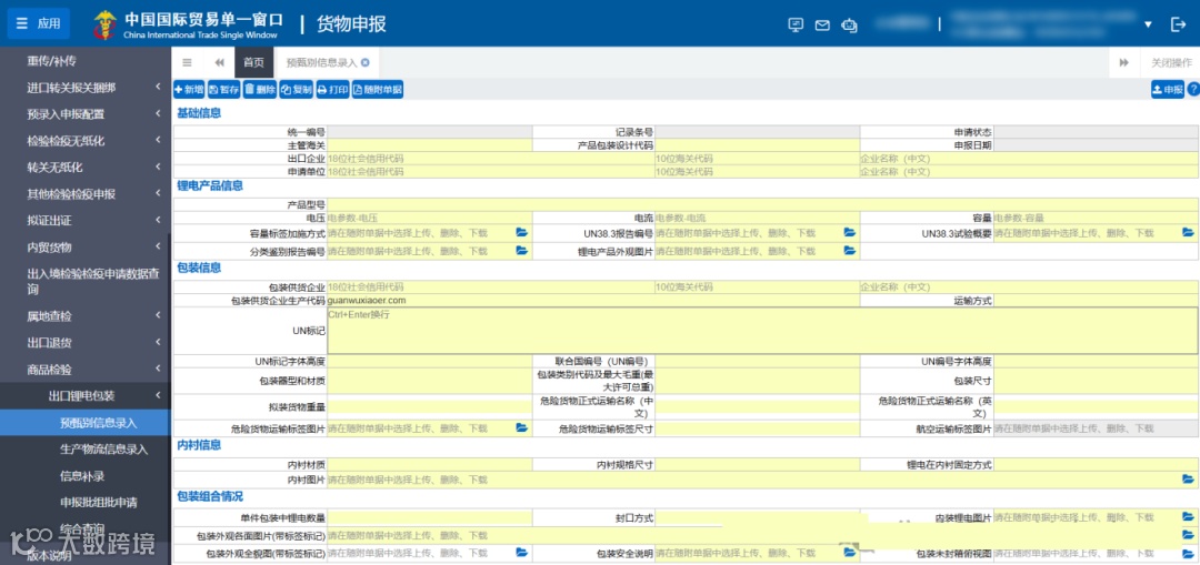 内装锂电图片:必填,不可录入,点击输入框按钮或通过随附单据进行图片上传,系统上传的图片信息返填,显示在当前字段。
