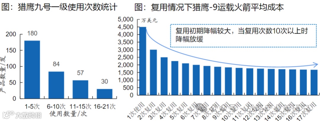 重复使用是未来商业运载火箭低成本发展的重要方向。一枚运载火箭的硬件成本占每次发射总成本的80%以上,尤其是发动机占据了绝大部分成本。发动机能否实现重复使用,是决定火箭回收和降低发射成本的关键因素。回收火箭维护后重复使用可降低发射成本,以猎鹰-9运载火箭为例,全新火箭在一次使用情况下总成本为4500万美元,在复用情况下一子级不需额外投入,仅需投入二子级和整流罩等,因此随着复用次数增加,其总体平均成本逐渐降低。