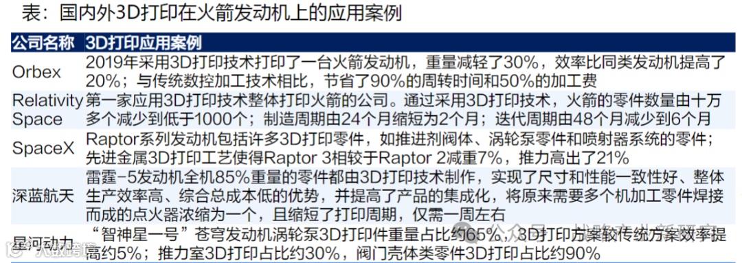 新技术趋势:3D打印:为降低火箭成本,火箭制造厂商尝试寻求新的技术路径,而3D打印技术正逐渐应用于火箭发动机生产中,较大程度降低了发动机的生产成本、缩短了研制周期。