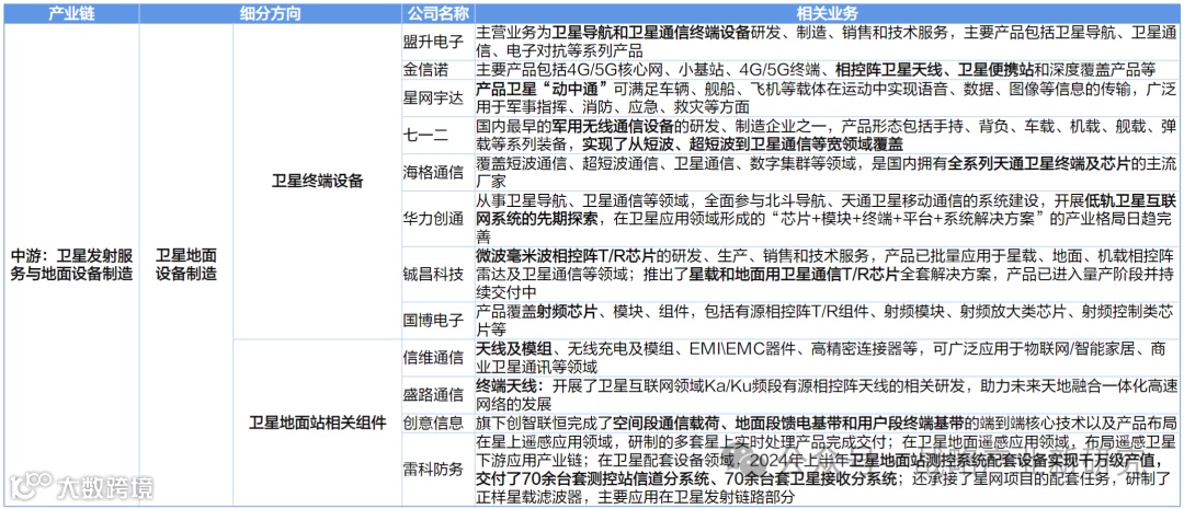 卫星终端设备厂商有盟升电子/金信诺/星网宇达/七一二(终端设备)、海格通信/华力创通(终端设备及芯片)、铖昌科技/国博电子(通信芯片)等。