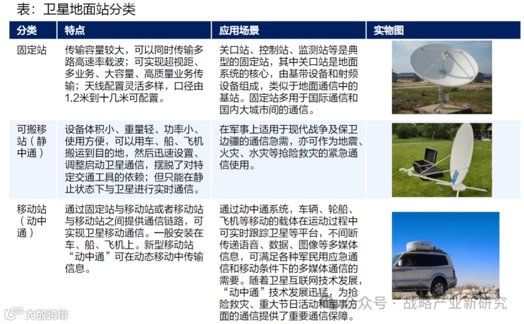 分类:地面站根据其是否可以移动的属性,分为固定站、可搬移站(静中通车载站便携站、背负站)、移动站(动中通车载站/船载站/机载站)等站型。