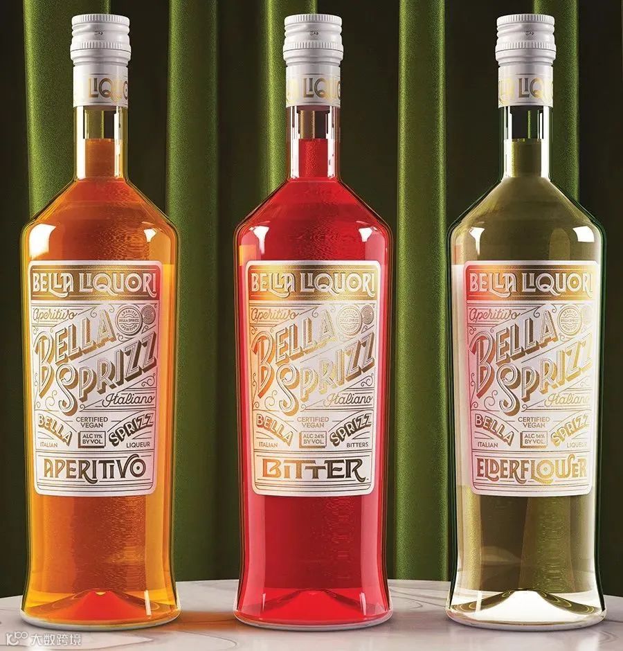 针对美国品牌Bella Sprizz,设计团队采用复古风格排版,结合定制字体和金色印刷饰面,打造经典感。