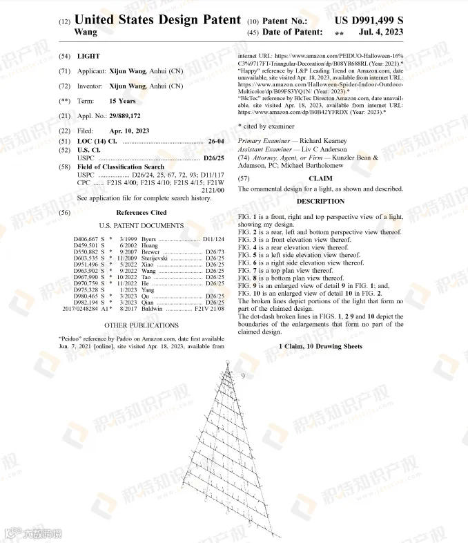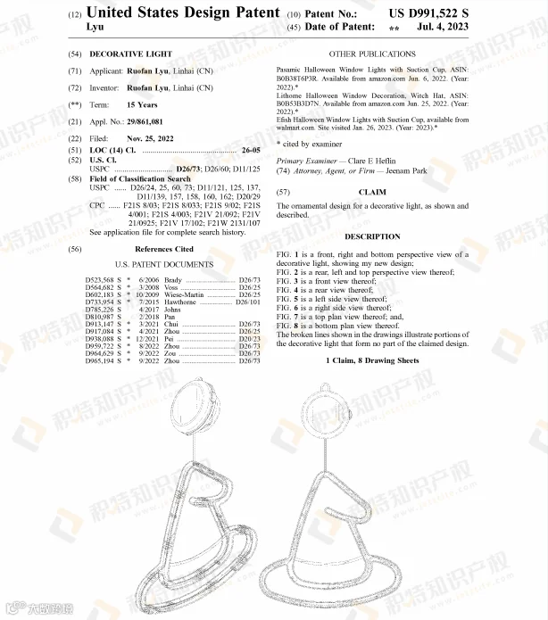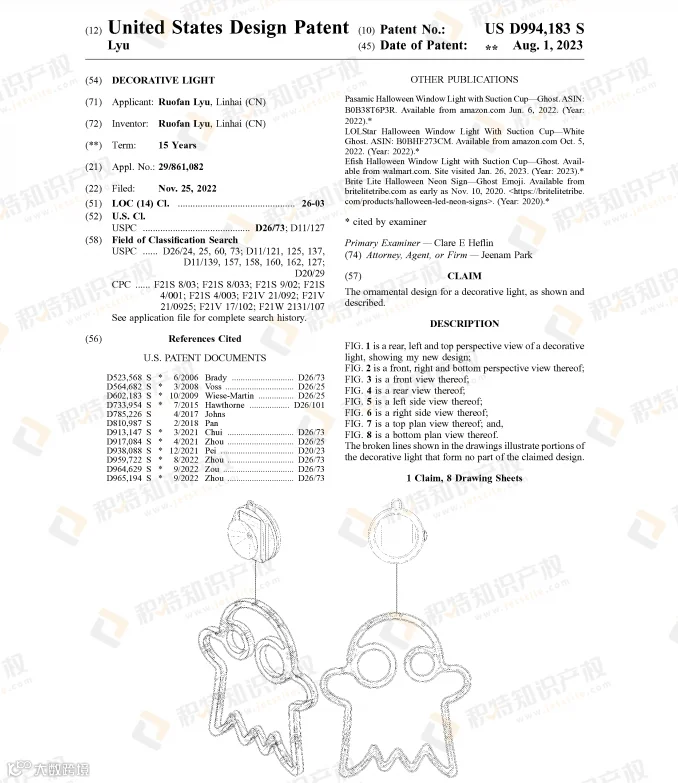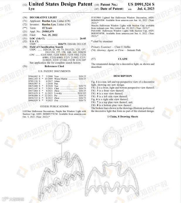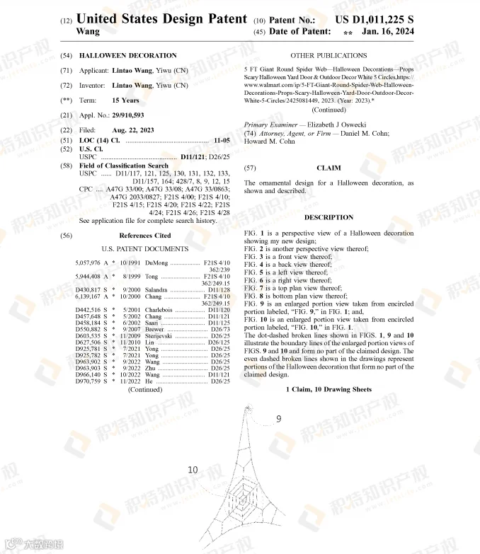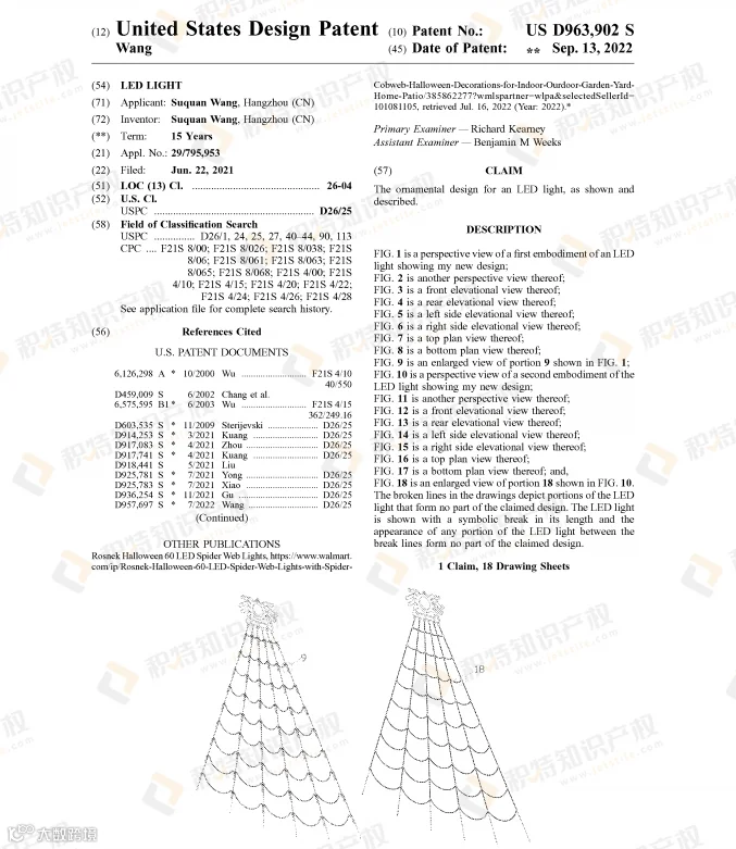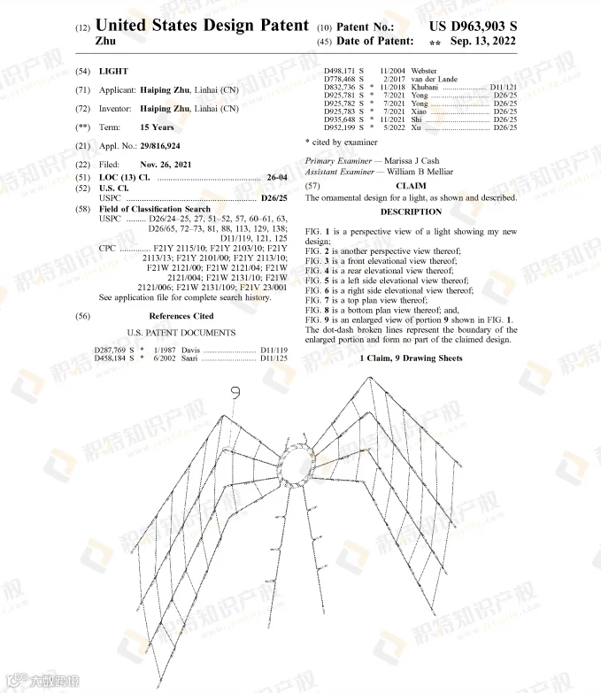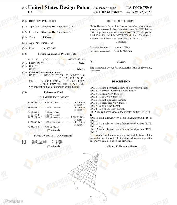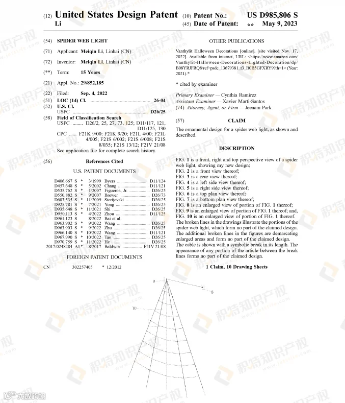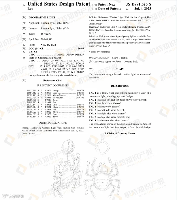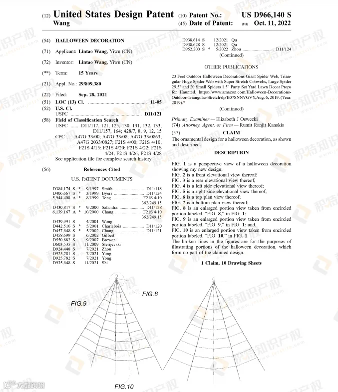 万圣节热销的蜘蛛网灯饰也是危机重重,近两年陆续有不少外观专利下证: