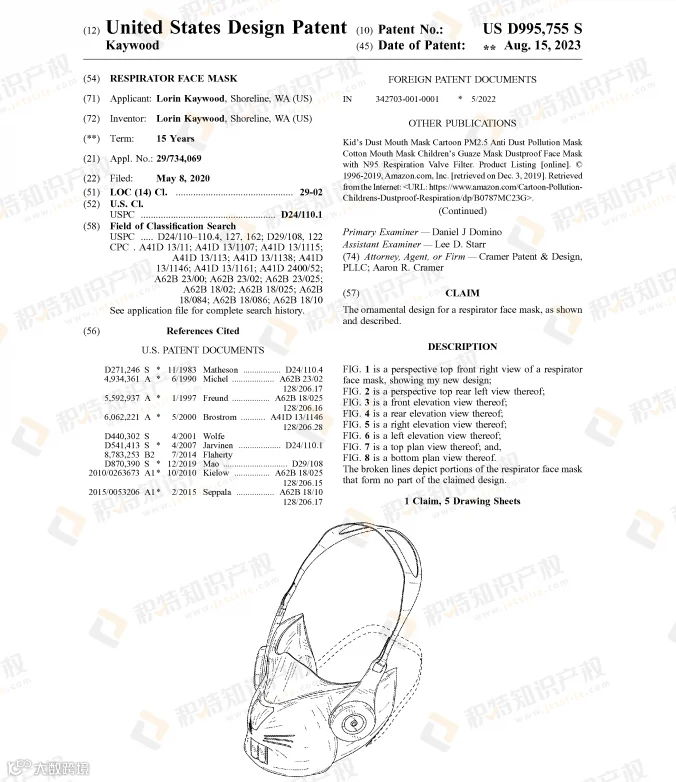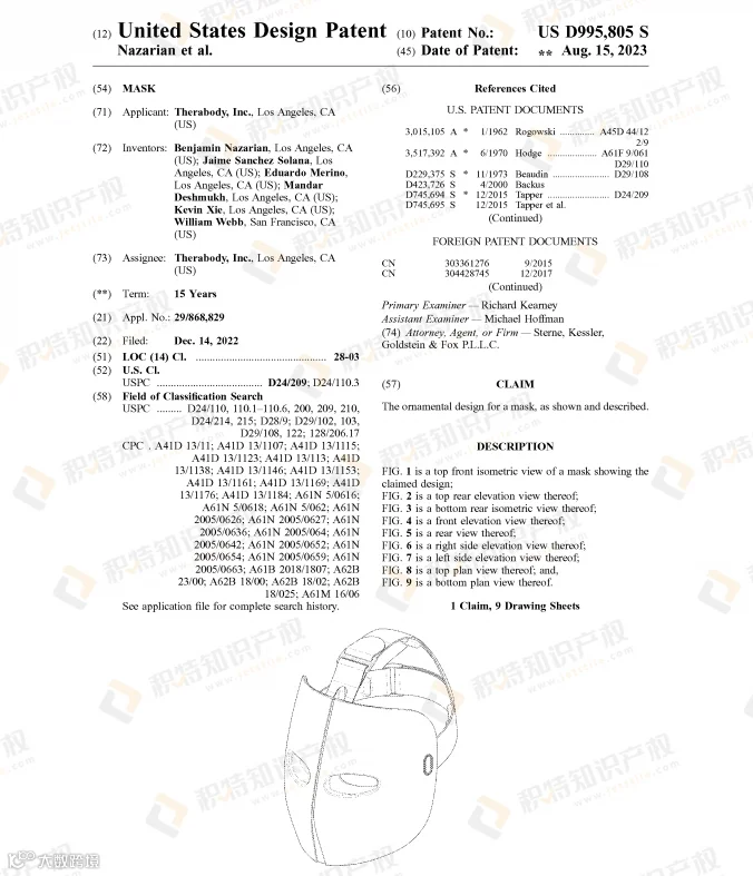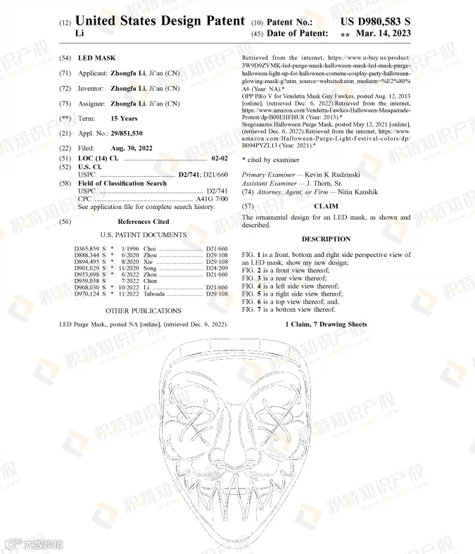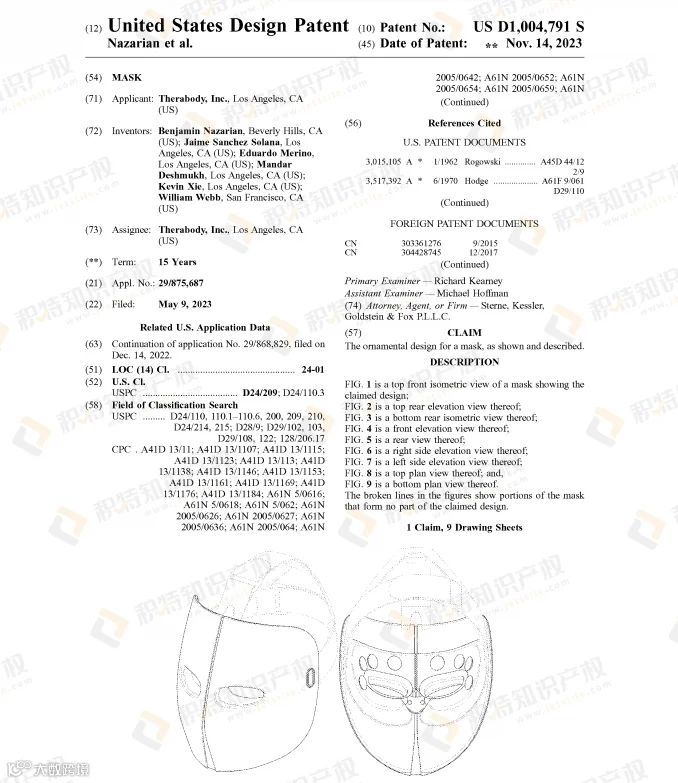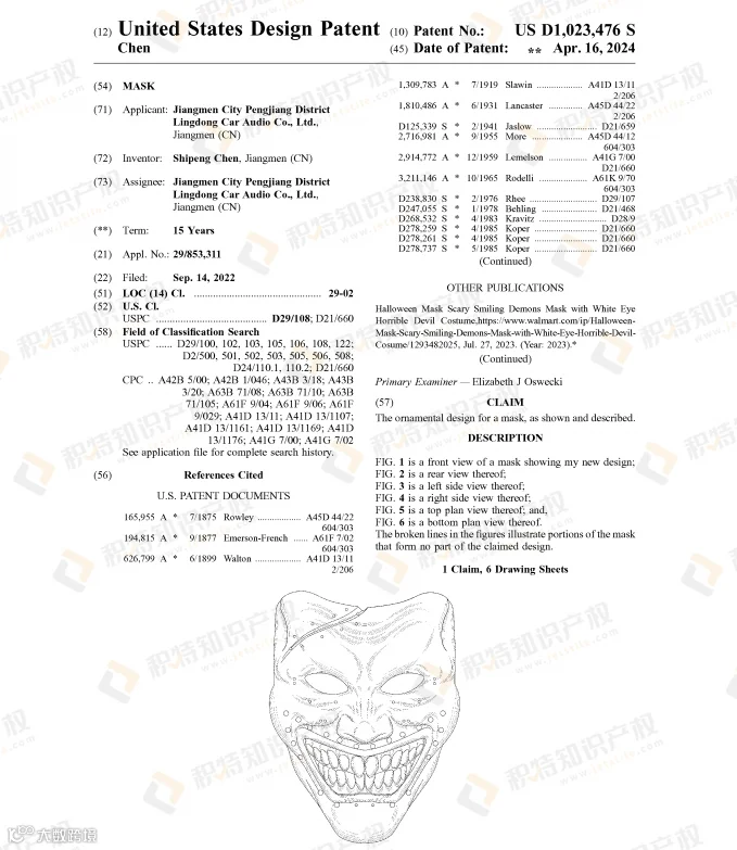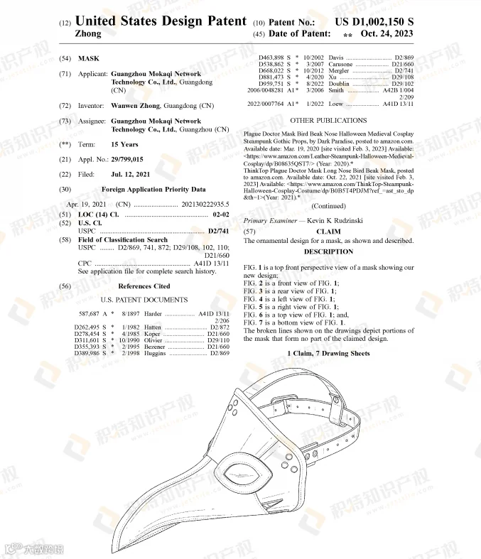 面具是万圣节cosplay的必备产品,有创意又能带来恐怖氛围的面具更易获得消费者的青睐。已有不少面具获得外观专利授权: