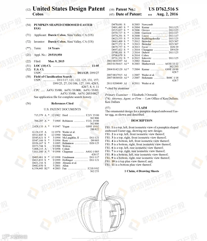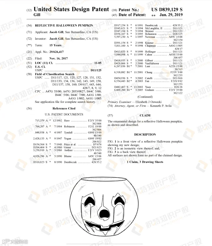 南瓜是万圣节标志性元素,各平台上在售的相关产品有很多,如南瓜灯、南瓜充气装饰,南瓜抱枕等等,而和南瓜相关的外观专利也不少: