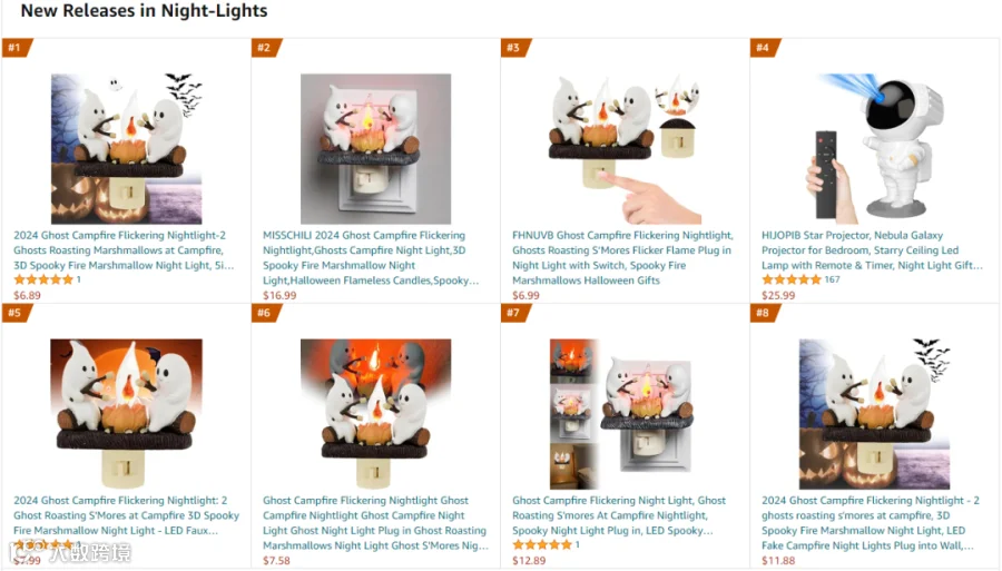 令人没想到的是,今年的万圣节爆单比以往要早一些,一款名为“GHOSTS ROASTING CAMPFIRE S’MORES ”的小夜灯霸榜亚马逊Night-Lights新品榜。