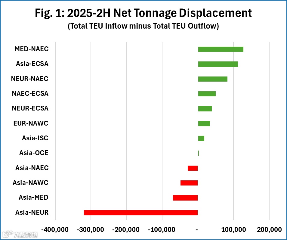 Moreover, the Mediterranean-North America East Coast (NAEC) route became the largest net receiver of cascade capacity in the second half of 2025, with 127,686 TEU of cascaded capacity, this number was driven by 178,189 TEUs from Asia-Mediterranean, with a transfer of 11 vessels of 14,000-15,000 TEU. Meanwhile, the Asia-East Coast South America route became the second-largest net gainer of cascaded capacity, with 112,998 TEUs, mainly consisting of mid-sized vessels of 8,000-14,000 TEU, which were shifted from the main East-West trade routes.