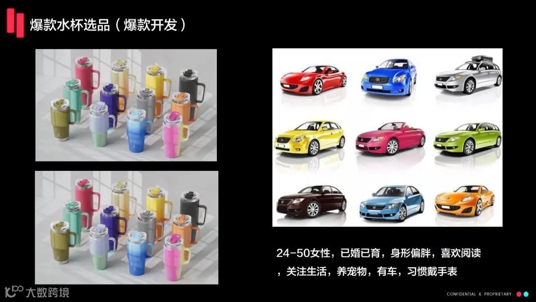 在产品开发方面,我们发现用户在车内展示水杯的场景特别受欢迎。因此,我们开发了针对车载使用场景的水杯,取得了成功。我们的产品针对的是25至50岁的已婚已育女性,这个群体在抖音上是主流消费者。我们通过阿里巴巴找到的杯子26元,但在海外市场可以以更高的价格销售,45英镑,这给了我们销售信心。