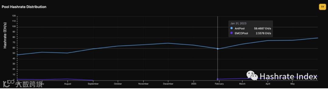 2022年7月,EMCD月均算力达到3.4 EH/s的历史峰值,但次月即停止独立出块。这一变化表明,其可能已将算力出售给其他矿池。根据算力波动趋势分析,Antpool为潜在买家之一,但尚未有确凿证据。