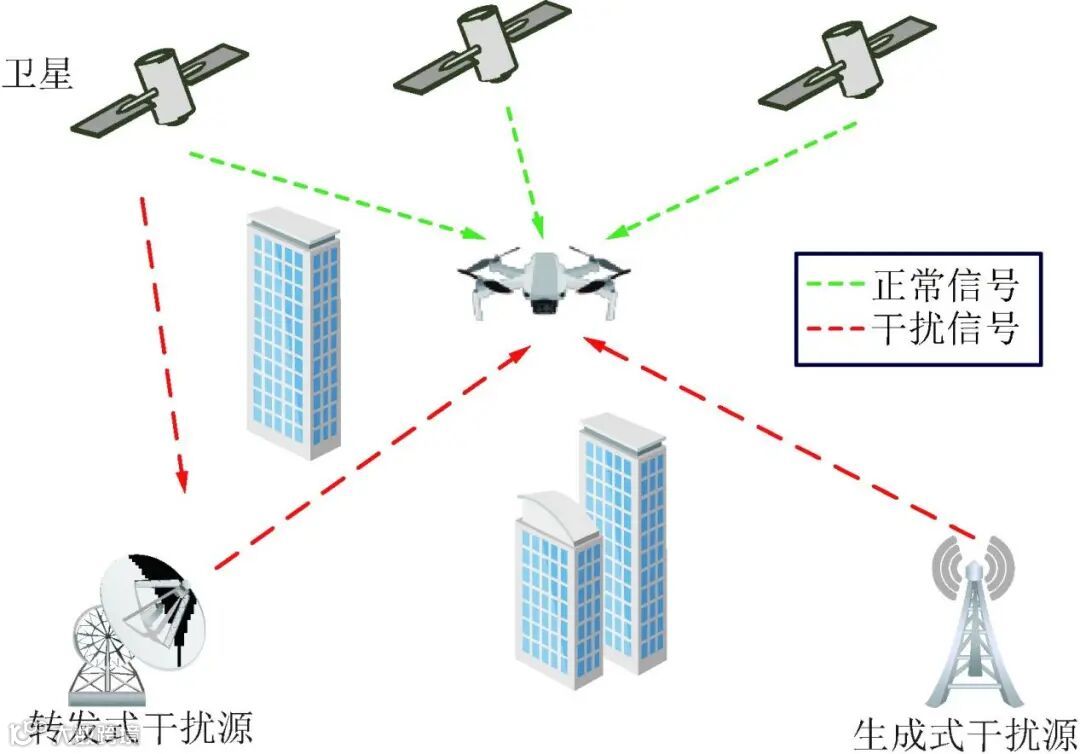 是一种常见的干扰方式,其原理是使用干扰机发射一个与导航信号频率重叠的干扰信号,且干扰信号功率远大于导航信号功率,从而使卫星导航接收机无法正常接收导航信号,导致接收机定位效果失效。