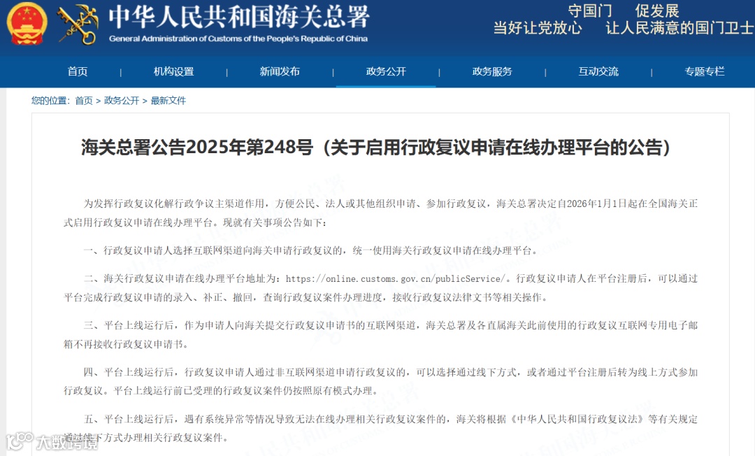 为发挥行政复议化解行政争议主渠道作用,方便公民、法人或其他组织申请、参加行政复议,海关总署决定自2026年1月1日起在全国海关正式启用行政复议申请在线办理平台。现就有关事项公告如下: