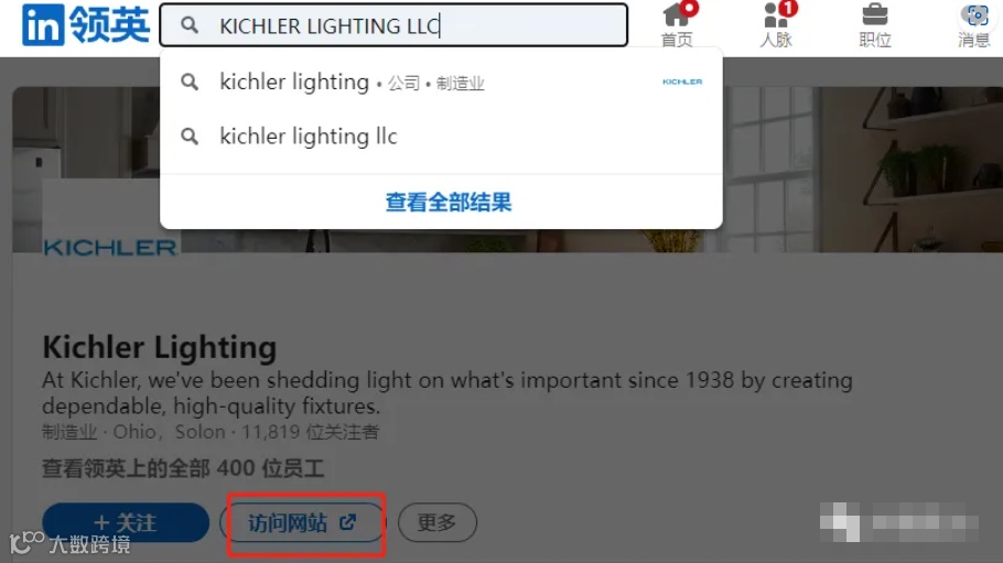 将公司名称放到领英上去搜索一下,就以上面搜到的第一个公司:KICHLER LIGHTING LLC为例,输入到领英搜索界面,我们选择公司,可以看到这家公司刚好在领英上有主页,规模也还不错,有400员工,也可以查看网站、查看具体的下面的公司员工,比如采购的一些信息。领英是目前全球最大的职场社交平台,全球有6亿多的用户在使用,而且这上面大客户很多,非常适合开发大客户。