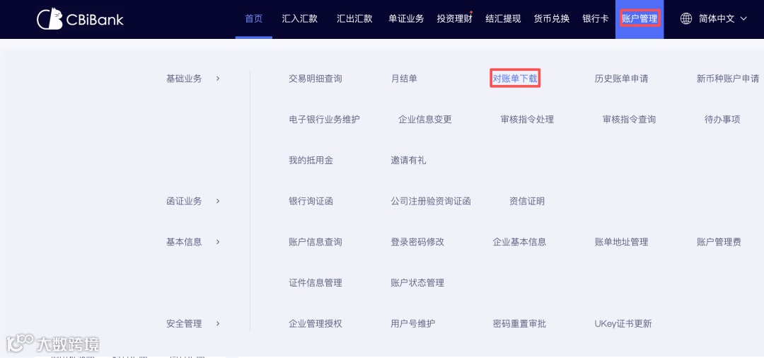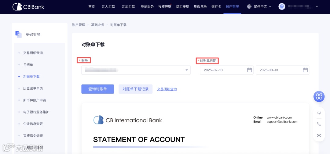 通过CBiBank企业网银,用户可快速完成对账单下载,操作流程如下:登录企业网银 → 【账户管理】→ 【对账单下载】。