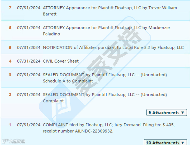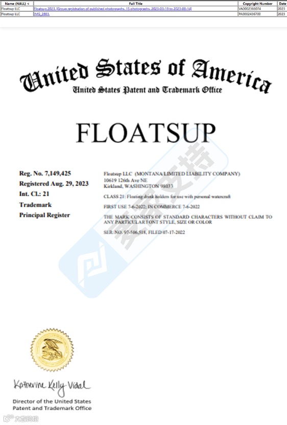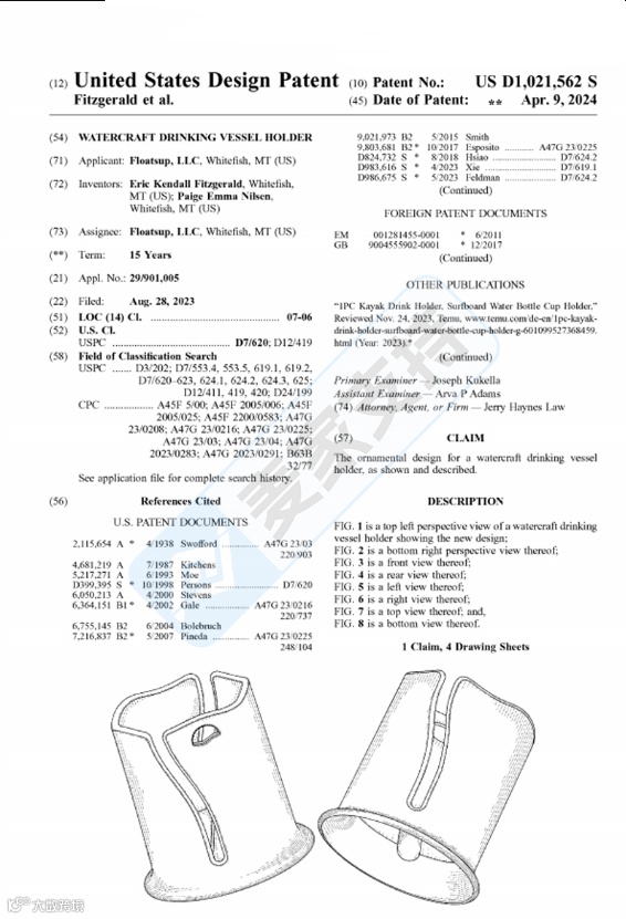 去年的一起匿名案件23-cv-15701,TRO冻结了不少卖家,时隔大半年,隐匿马甲再度归来。不同的是,麦家支持通过搜索发现,Floatsup, LLC继上次TRO专利号为:11794860维权后,在2024年4月9日又新下证了一个专利,专利号为:D1021562;除此之外该公司还注册有Floatsup商标以及多张版权,跨境卖家需注意避雷。