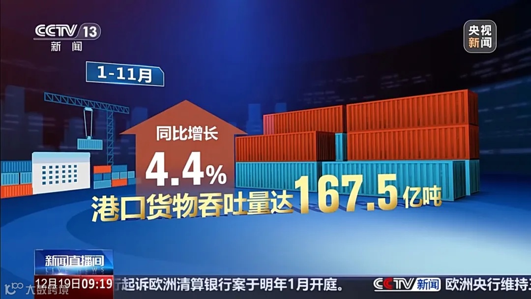 交通运输部数据显示,1-11月,港口货物吞吐量达167.5亿吨,同比增长4.4%。集装箱吞吐量达3.2亿标箱,同比增长6.6%,其中外贸集装箱吞吐量同比增长9.5%。