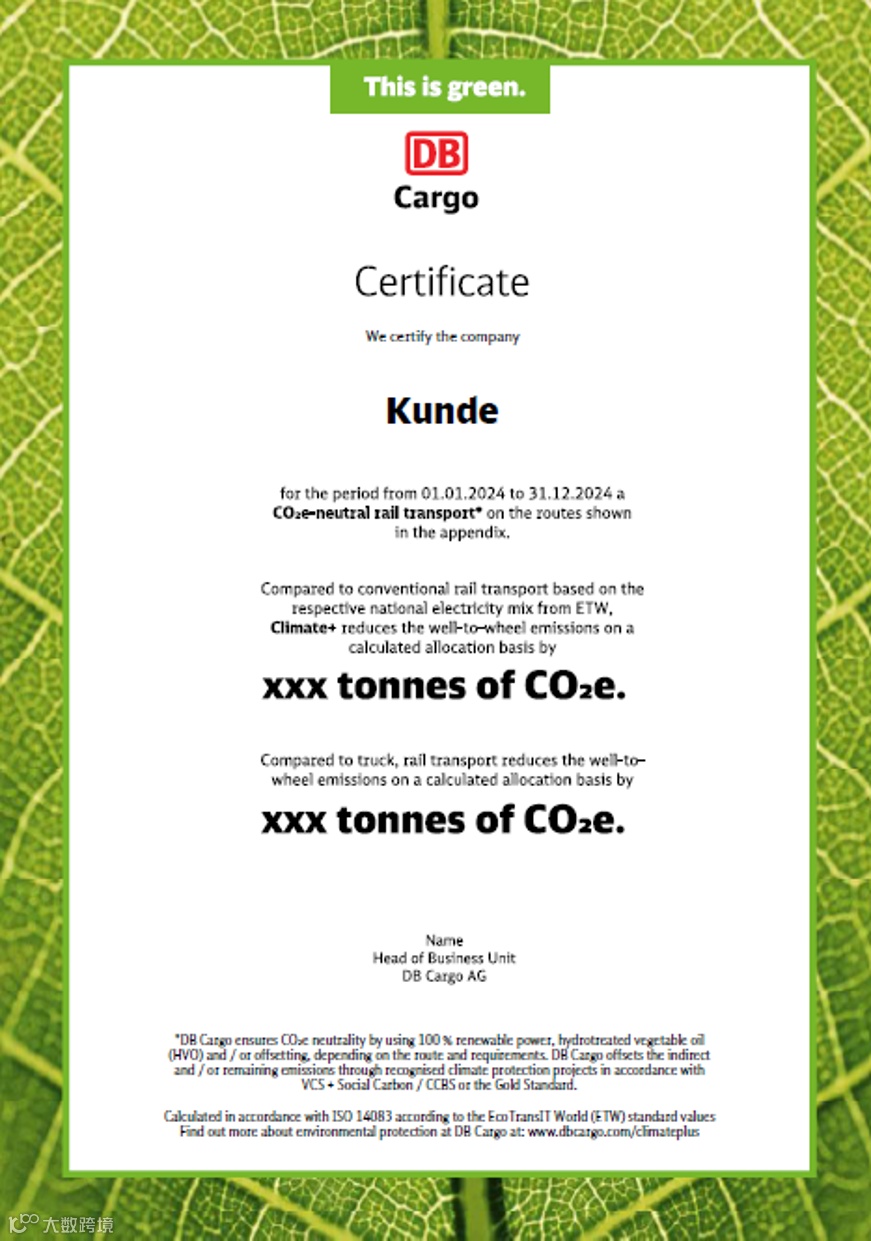 *德铁货运通过使用100%绿色电力或HVO(视线路及需求而定)实现碳中和,并通过支持VCS+Social Carbon/CCBS或黄金标准气候项目抵消剩余或间接排放。