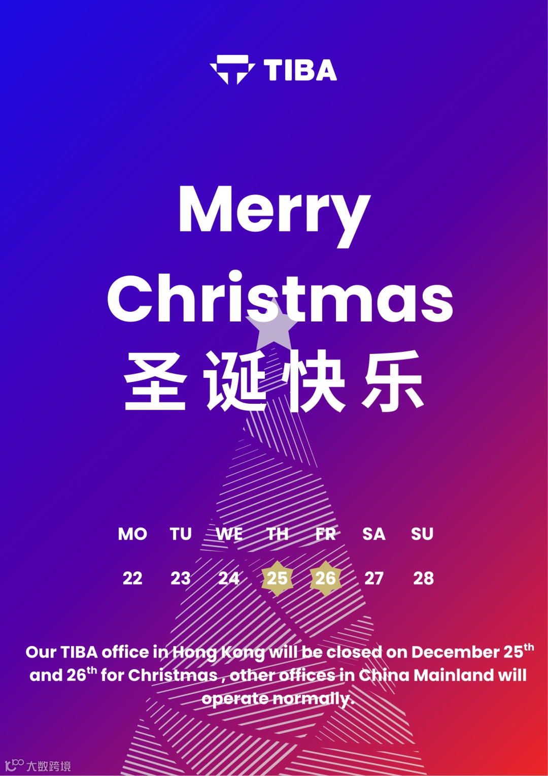 TIBA Hong Kong office will be closed on December 25th and 26th for Christmas, other TIBA offices in China Mainland will operate normally.