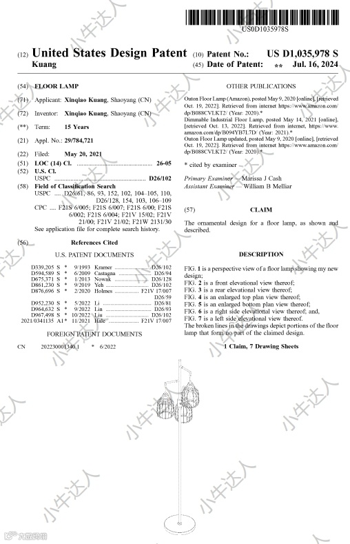 经查询,这款产品于2021年5月20日在美国进行外观专利申请的提交,于2024年7月16日获得了公告。