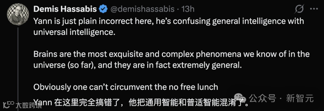 Hassabis并没有直接否定LeCun的数学推断,只是说他打错了靶心——混淆了「通用智能」与「普适智能」的概念。
