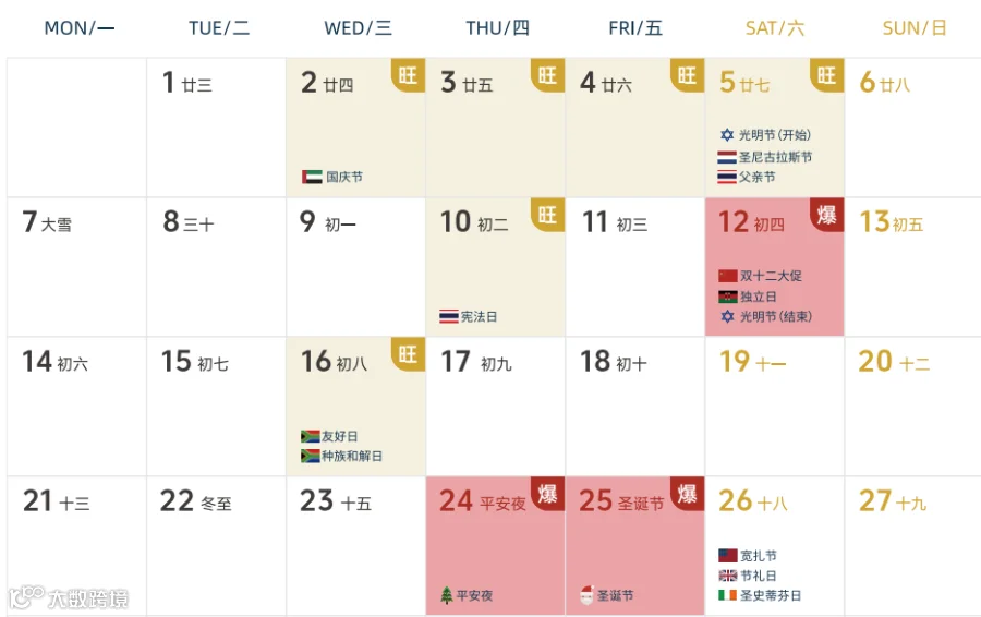 无论您主营欧美、拉美还是东南亚市场,翻开当月日历即可快速掌握各国“红日子”,提前规划营销节奏,精准捕捉潜在爆单节点。