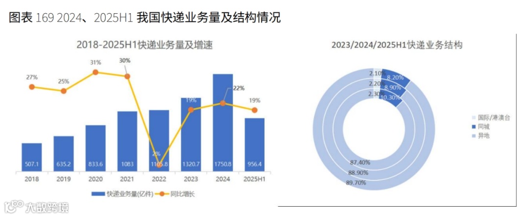2025年上半年快递业务量(不含邮政集团包裹)达956.4亿件,同比增长19.3%。其中同城78.8亿件(+6.2%)、异地857.4亿件(+20.6%)、国际/港澳台20.2亿件(+22.5%)。行业日均业务量超5亿件,展现强劲韧性 [2] 。