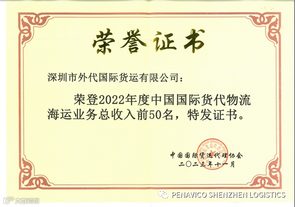 From November 15th to 17th, 2023, the 2023 China International Freight Forwarding and Logistics Industry Forum and the China International Freight Forwarding and Logistics Industry Development Blue Book (2022) Press Conference was held at the Tianjin National Convention and Exhibition Center Grand, co-sponsored by the China International Freight Forwarders Association and Tianjin Municipal Commerce Bureau. At this forum, the top 100 of China's international freight forwarding and logistics industry in 2022, generated based on the Ministry of Commerce's registration data system, was officially announced. Penavico Shenzhen Logistic Ltd., a subsidiary of China Ocean Shipping Agency Shenzhen Co., Ltd. (abbreviated as Penavico Shenzhen), ranked among the "Top 100 China International Freight Forwarding Logistics Total Revenue in 2022" and "The Top 50 China International Freight Forwarding Logistics Maritime Business Total Revenue 2022" with its excellent operating performance in 2022.