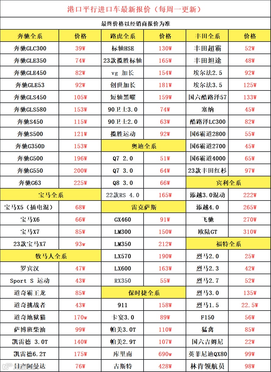 奔驰大G系列,G350D现在153w就能提车;奔驰G400D 169w;G500的话现在港口价格在196w;而G63现在港口最便宜225w就能提车;