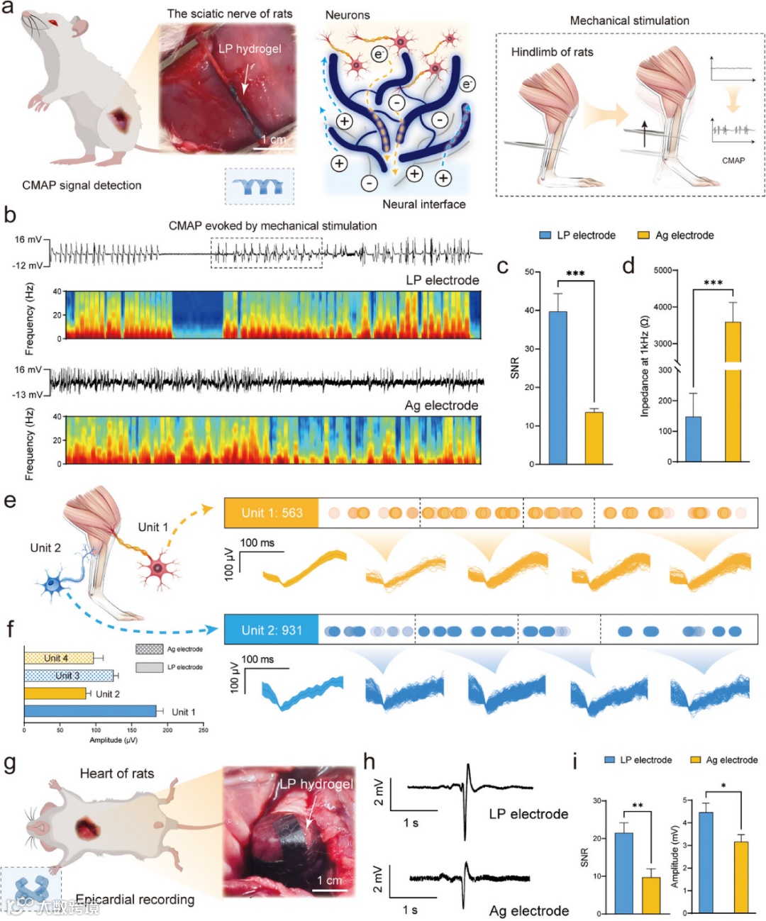 在大鼠坐骨神经信号监测实验中,LP水凝胶以螺旋方式自卷曲到大鼠坐骨神经表面,其宽导电范围为神经界面处的电子提供了有效传输通道,有助于检测复合肌肉动作电位(CMAP)(图5)。与手动卷曲的银箔电极相比,LP水凝胶的信噪比(SNR)高出约三倍,这源于其卓越的电化学性能,特别是高电导率和低阻抗。此外,LP水凝胶还能够选择性隔离来自两个独立神经单元的动作电位,表现出识别和记录更广泛神经活动的卓越能力。这种捕获更广泛高保真神经信号的增强灵敏度来自其优异的界面贴合性和优化的神经界面功效。当将LP电极以交叉对称卷绕图案附着在大鼠心脏的心外膜上时,记录的心电信号幅度和SNR显著高于银电极。