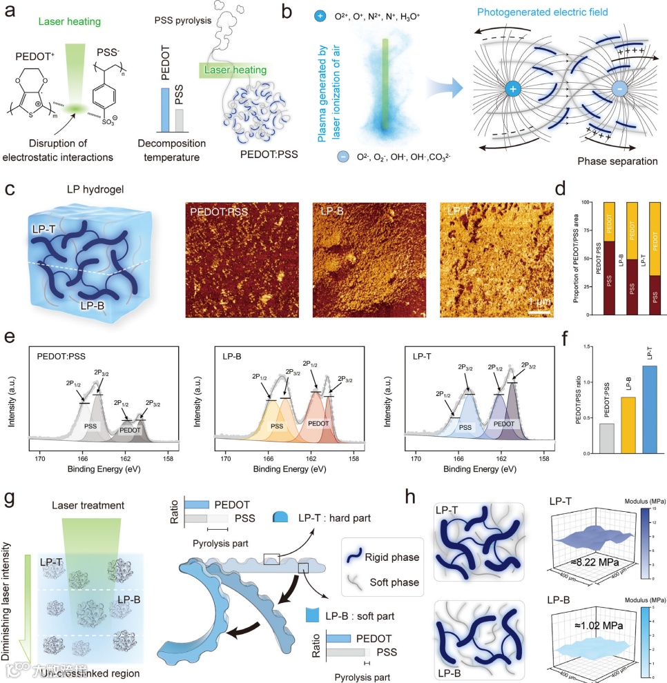 激光蚀刻诱导的相分离主要机制是激光光热效应和光生电场形成共同作用导致PEDOT和PSS之间静电相互作用减弱(图2)。光热转换导致PEDOT-PSS相互作用破坏和PSS的选择性分解,光生电场源于激光诱导空气电离产生的等离子体建立的局部垂直电场,促进PEDOT和PSS的相分离。AFM相成像显示,激光处理区域的PEDOT相(黄色)含量更高。此外,LP水凝胶顶部(LP-T)和LP水凝胶底部(LP-B)的PEDOT含量不同,LP-T表现出更高的比例,表明LP结构内相分离程度存在差异。XPS显示LP-T、LP-B和未处理的PEDOT:PSS的PEDOT/PSS比率分别为1.23、0.79和0.42。激光刻蚀和激光能量在LP薄膜内的锥形扩散还产生了交错沟槽-脊形态,脊对应具有较高刚度的PEDOT富集LP-T域,而沟槽对应具有较大柔软度的PSS富集LP-B域。这种交替的刚-柔沟槽结构提供了内在各向异性,容易在外部刺激下发生弯曲或卷曲,为LP水凝胶的自卷曲行为奠定了结构基础。