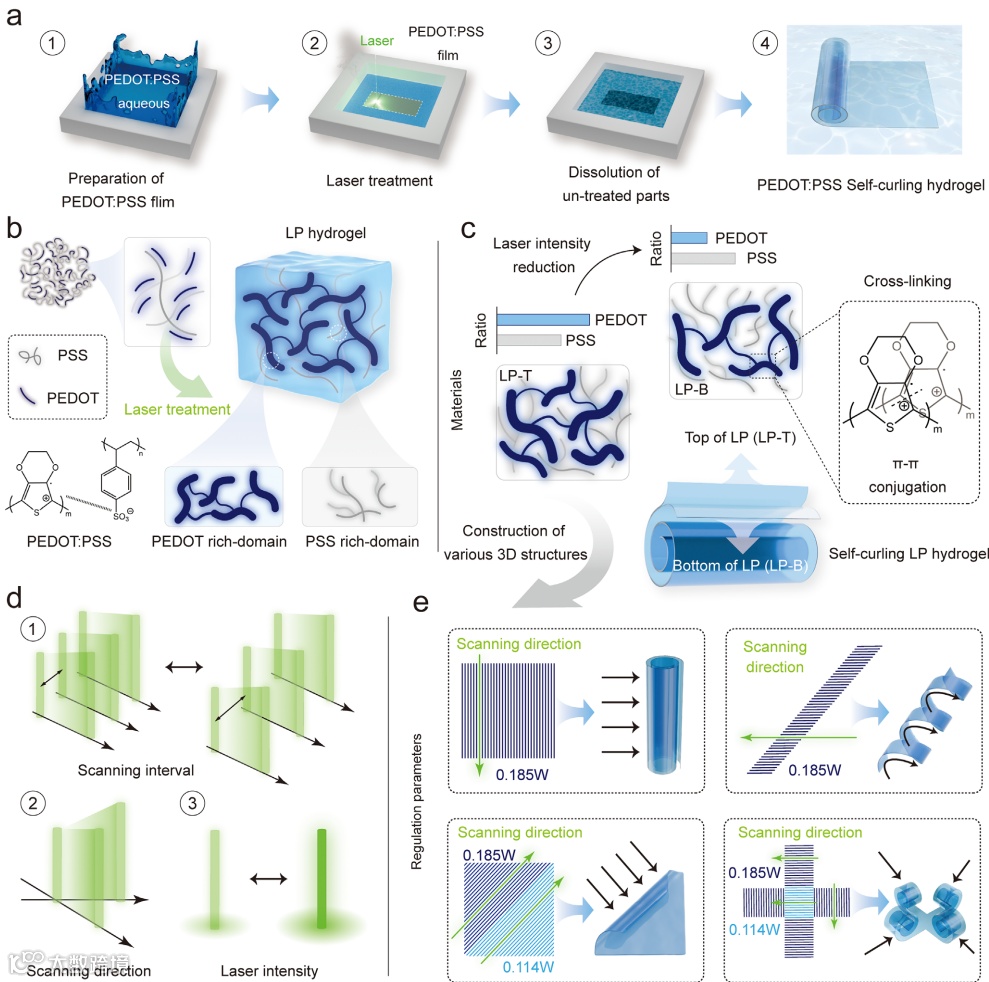 近日,四川大学范红松、卫丹等开发了一种具有交替刚-柔沟槽结构的激光蚀刻PEDOT:PSS(LP)水凝胶,在材料内部产生差异化的相分离、构象转变和结晶度分布,通过调节差异内应力展现出可调的自卷曲性能。