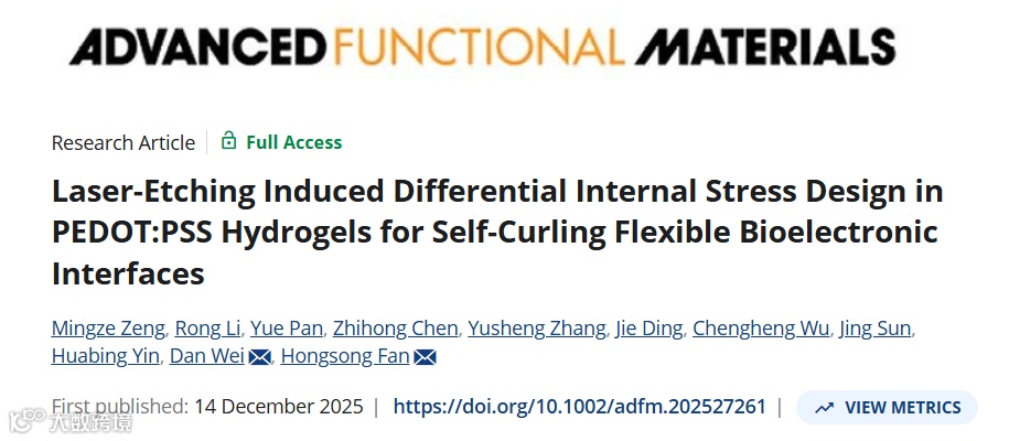 2025年12月14日,研究成果以“Laser-Etching Induced Differential Internal Stress Design in PEDOT:PSS Hydrogels for Self-Curling Flexible Bioelectronic Interfaces”为题,发表在《Advanced Functional Materials》上。四川大学生物医学工程学院/国家生物医学材料工程技术研究中心曾明泽博士为文章第一作者,范红松教授和卫丹副研究员为文章共同通讯作者。