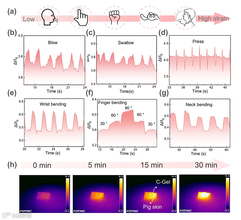 将C-Gel传感器贴附于人体,可准确捕捉从吞咽、吹气等微小肌肉活动,到手指、手腕、颈部等大关节弯曲运动,产生的电信号变化(ΔI/I₀)与动作幅度及角度具有良好的对应关系,并能清晰区分不同弯曲角度(30°/60°/90°)。红外热成像实验显示,在模拟日光照射下,C-Gel的温升行为与猪皮肤(常用人体皮肤模型)高度相似,证实了其用于仿生电子皮肤的适用性。