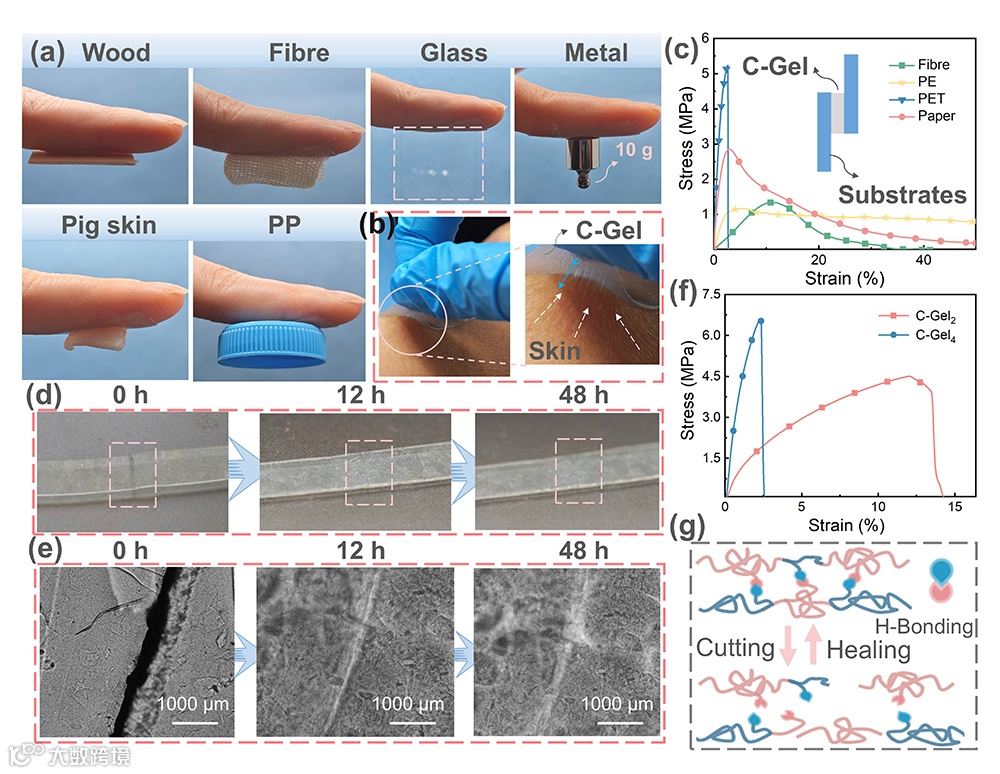C-Gel凭借聚合物链中丰富的-COOH和-COO⁻基团,对多种基底表现出普适性粘附。定量剪切测试显示,其对PET和纸张的粘接强度分别达5.24 MPa和2.84 MPa。其自修复能力源于动态氢键网络,切断的样品在愈合48小时后,断面几乎消失,修复后的拉伸强度可恢复至6.6 MPa,展现了出色的实用可靠性。