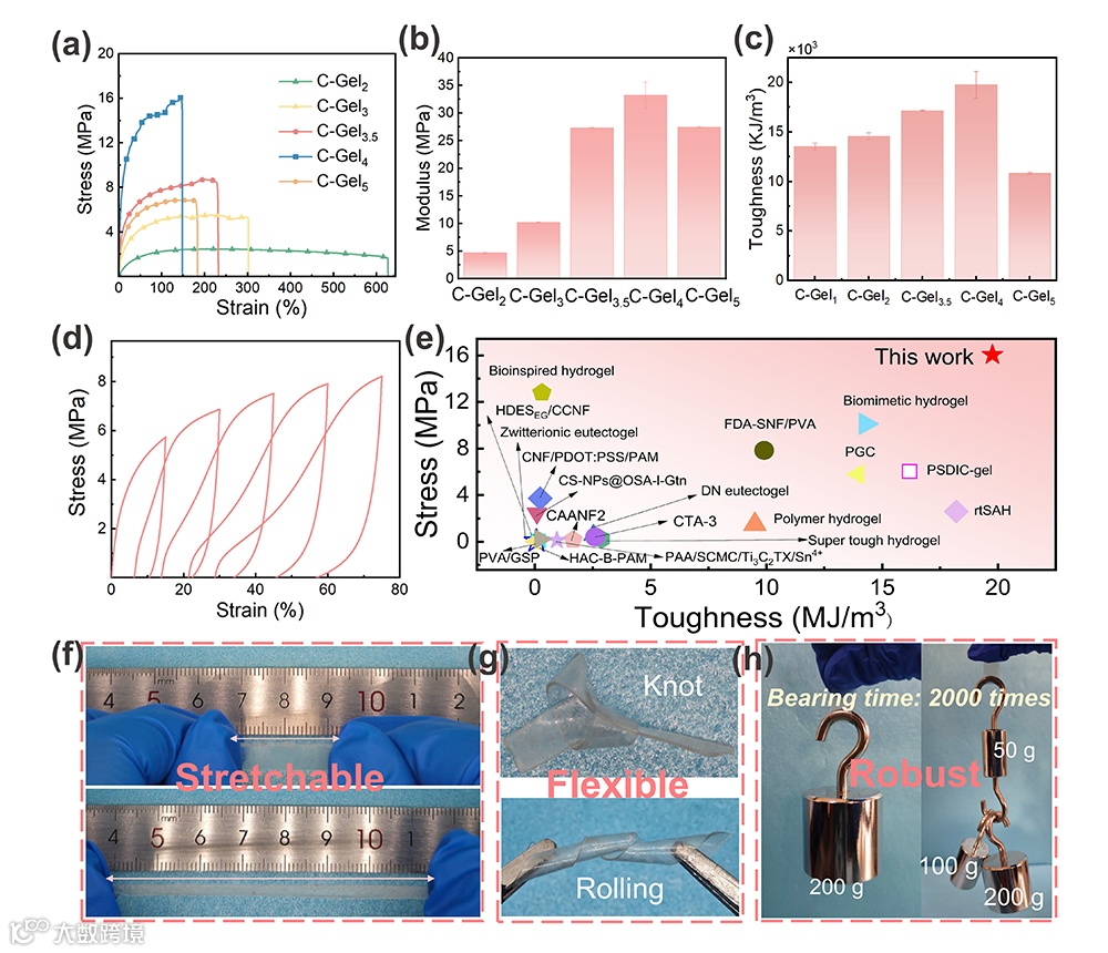 传统凝胶材料往往顾此失彼——高强度则脆,高拉伸则软。本研究通过上述仿生复合策略,使得材料同时获得了优异的拉伸强度、延展性与韧性。其中C-Gel4(AA:ChCl = 4:1)拉伸强度达16.05 MPa,断裂伸长率约148%,韧性达到了19.76 MJ/m³,并在2000次加载循环后未发生明显损坏。与文献报道的多种凝胶对比,C-Gel在强度-韧性协同方面展现出明显优势。